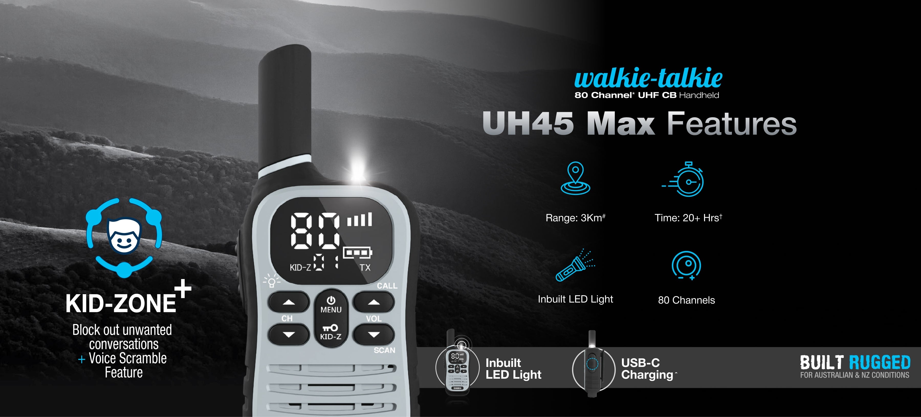 The UH45 Series now features Kid Zone Plus – giving parents peace of mind by blocking out unwanted conversations, ensuring kids can safely use the radios with family and friends. Kid Zone Plus also includes a Voice Scramble feature for added privacy.