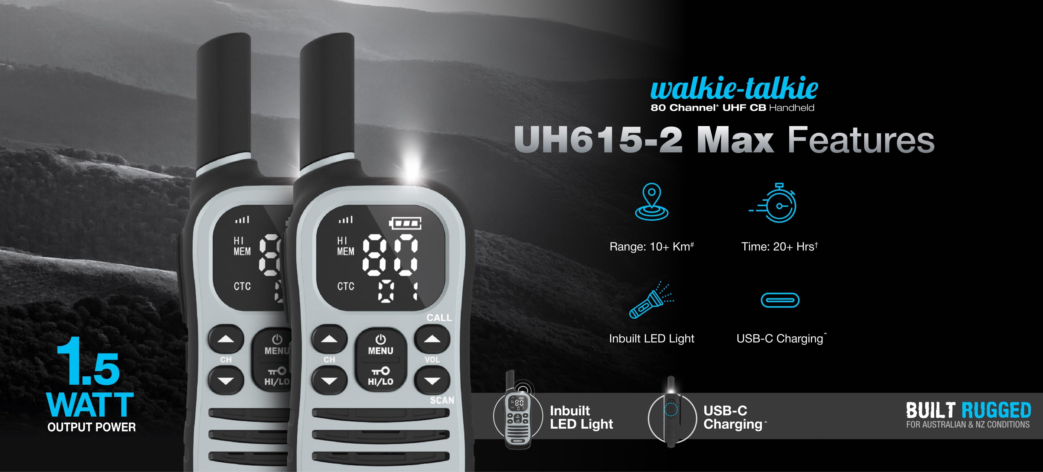 Built tough for Australia’s harsh conditions, the UH615-2 Max delivers outstanding performance in a compact, lightweight design with 1 Watt of power for extended range. With up to 10+ km communication range, you can confidently venture further while staying in touch. An integrated LED light provides extra safety and convenience, particularly during night hikes or emergencies.